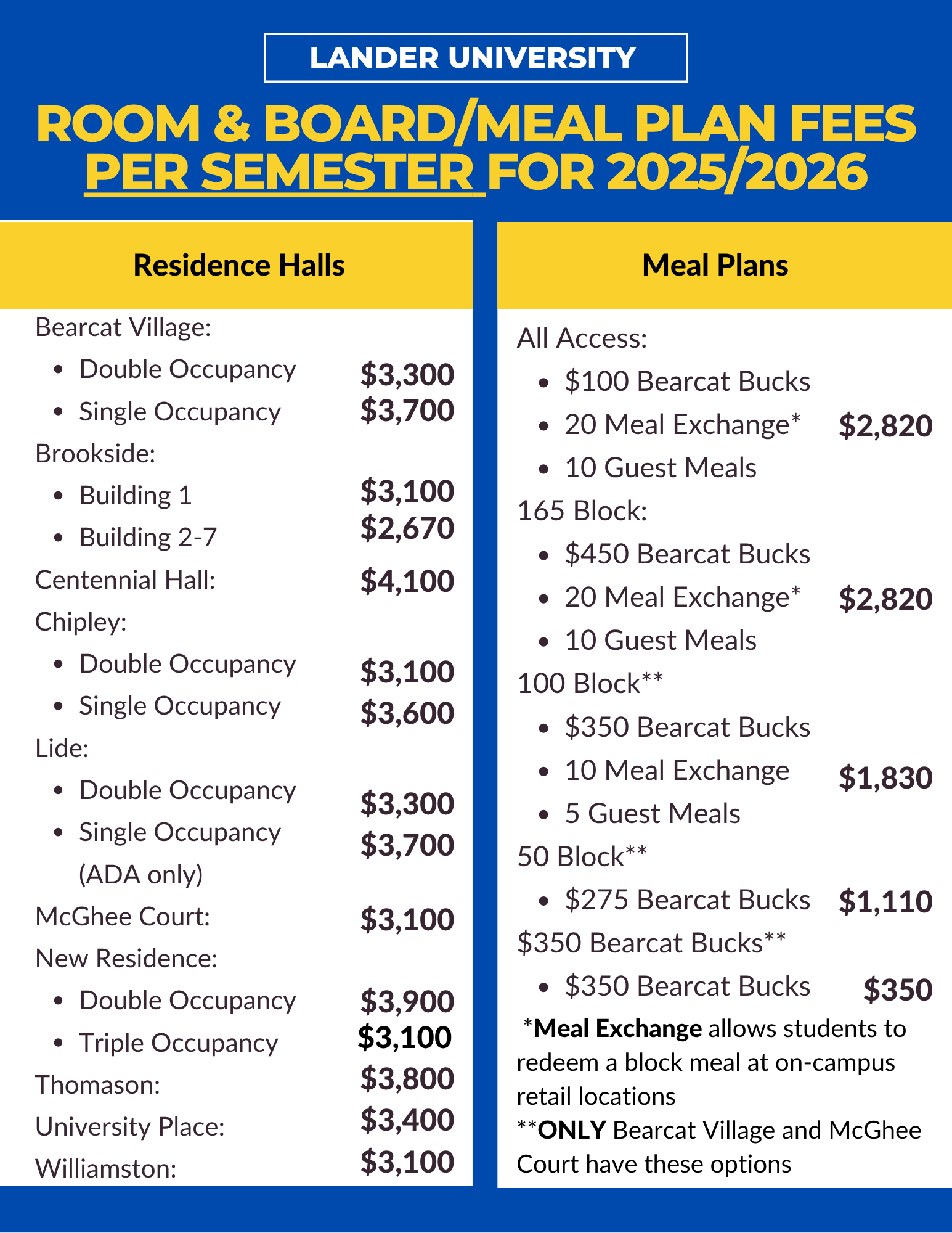 Residents are provided fully furnished housing accommodations, including meals, as part of the housing contract. Rates vary by residential area and can be found on the Residence Hall feature page. You can also print a list of all rates here.