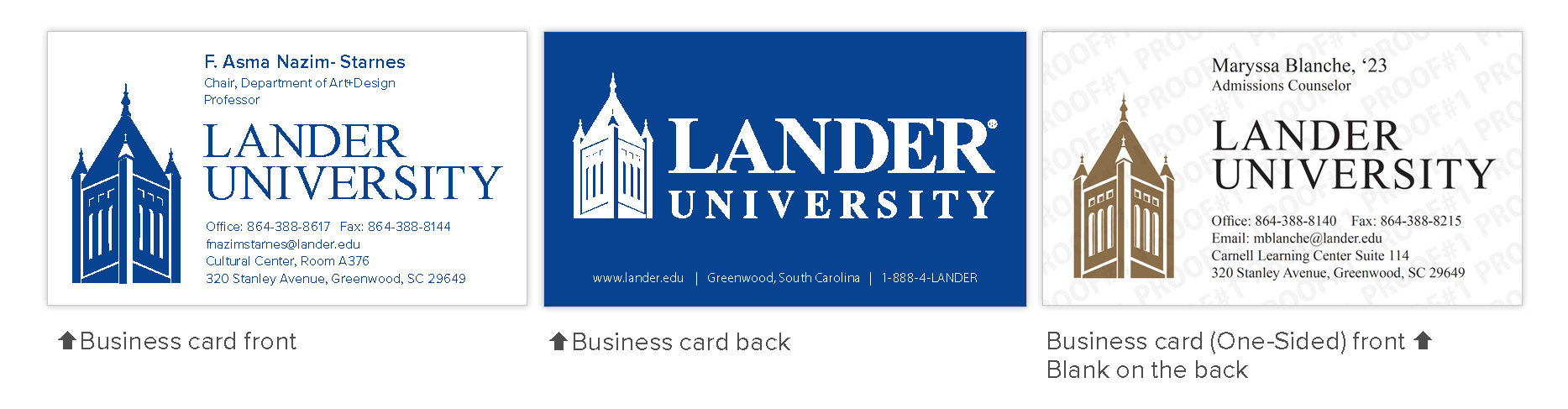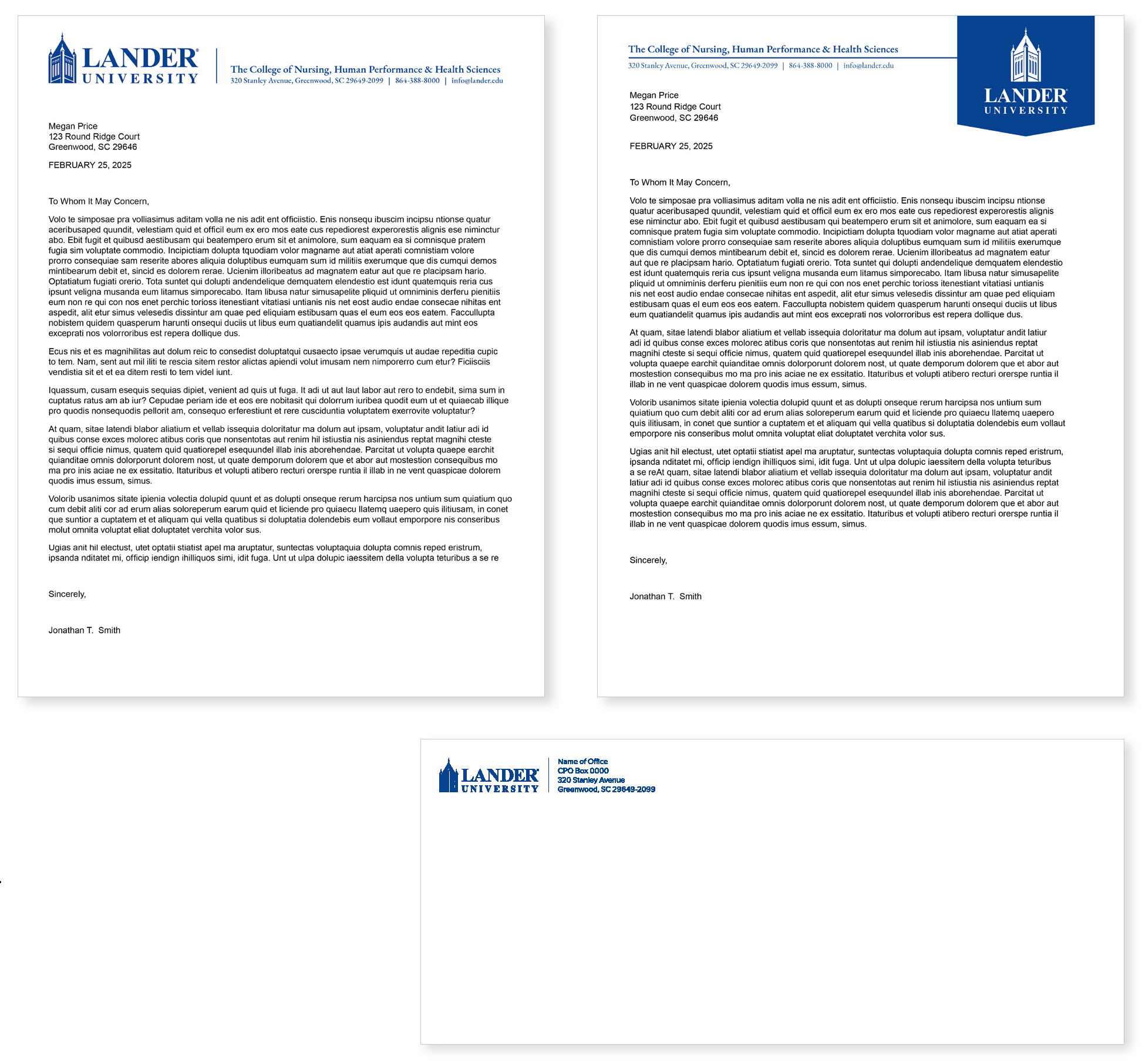 Digital university letterhead may be downloaded from lander.edu/brand or obtained through the Office of Printing Services. All printed stationery (letterhead, envelopes and business cards) orders require a signed requisition form and should be made through Printing Services. The department ordering the materials is responsible for the cost of the production.
