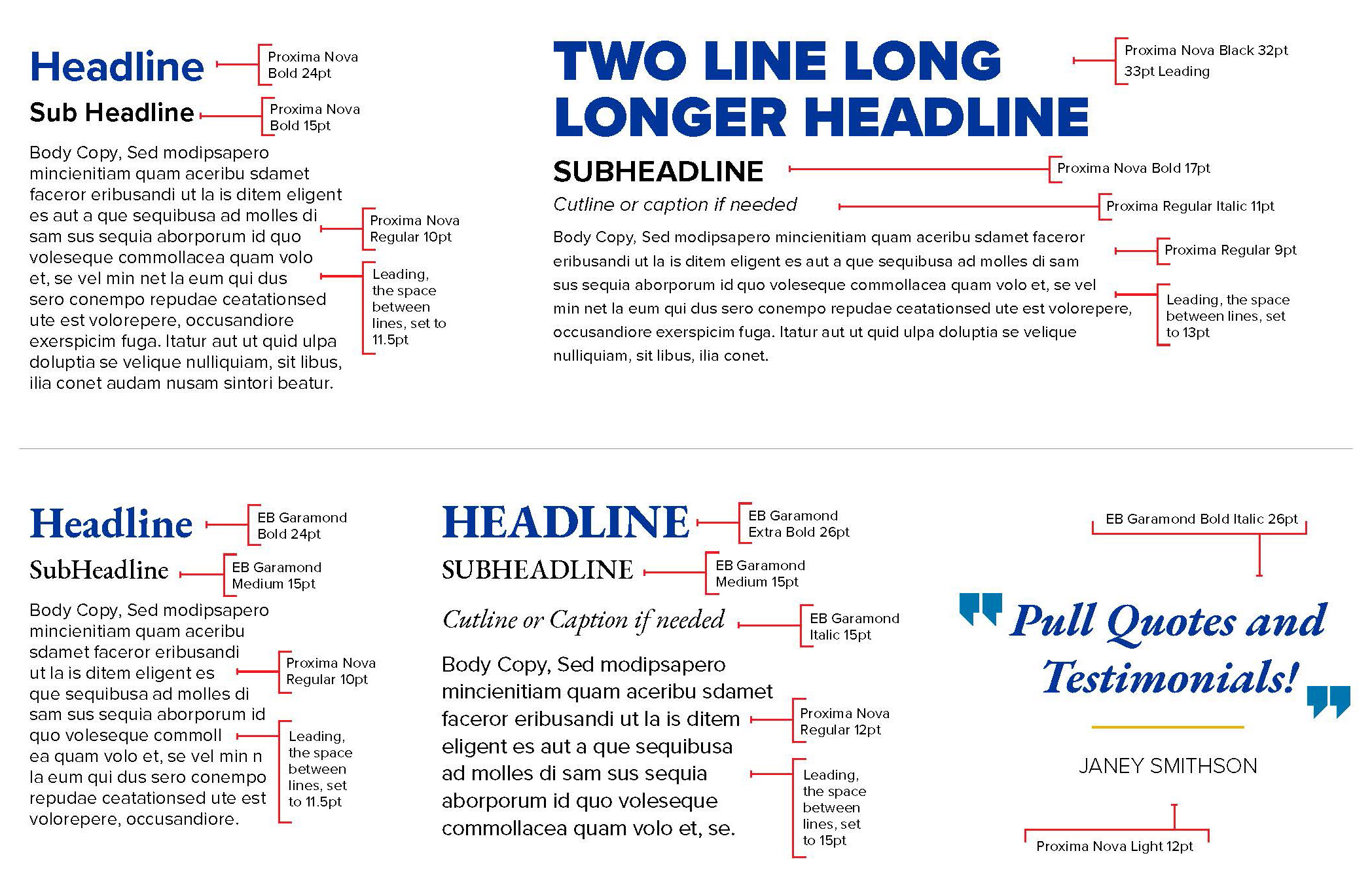 Below are examples of how to use the Lander University typefaces in the design of text for marketing and internal materials. In most cases a suitable body copy size for reading is anywhere between 9- to 12-point type. This sentence is in 10-point type. However, point size is not consistent across fonts: