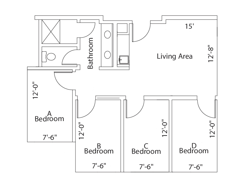 The residence hall features suite-style living. Each suite has four single-occupancy bedrooms sharing a common living space and a bathroom. Each bathroom has separate toilet and shower areas, along with double sinks, for accommodation of several students at one time. Bedrooms and common areas are fully furnished.