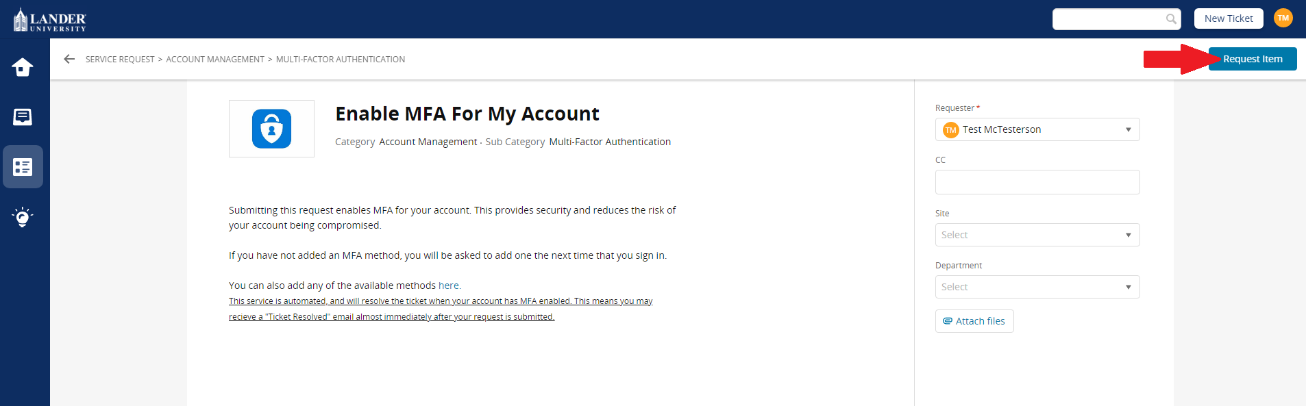 Click this link to submit a Service Desk request to enable MFA on your account.
