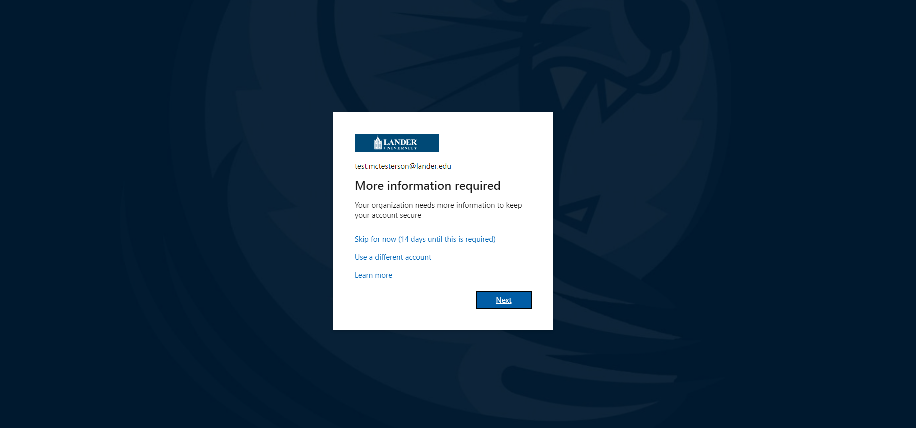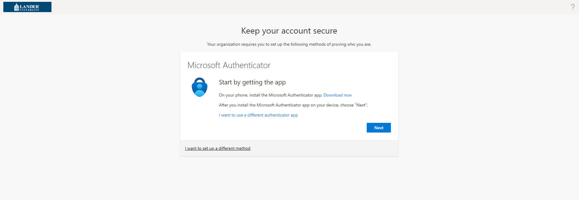 Go to https://outlook.com/lander.edu and sign in with your Lander.edu email address. After you sign in you will be prompted to set up MFA. Click Next to start.