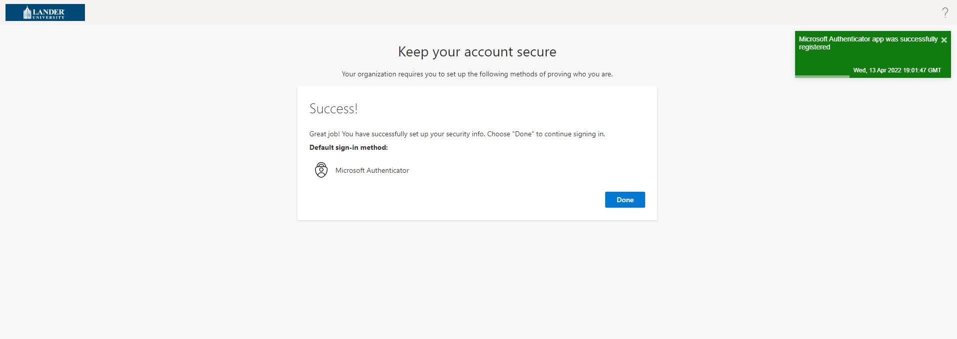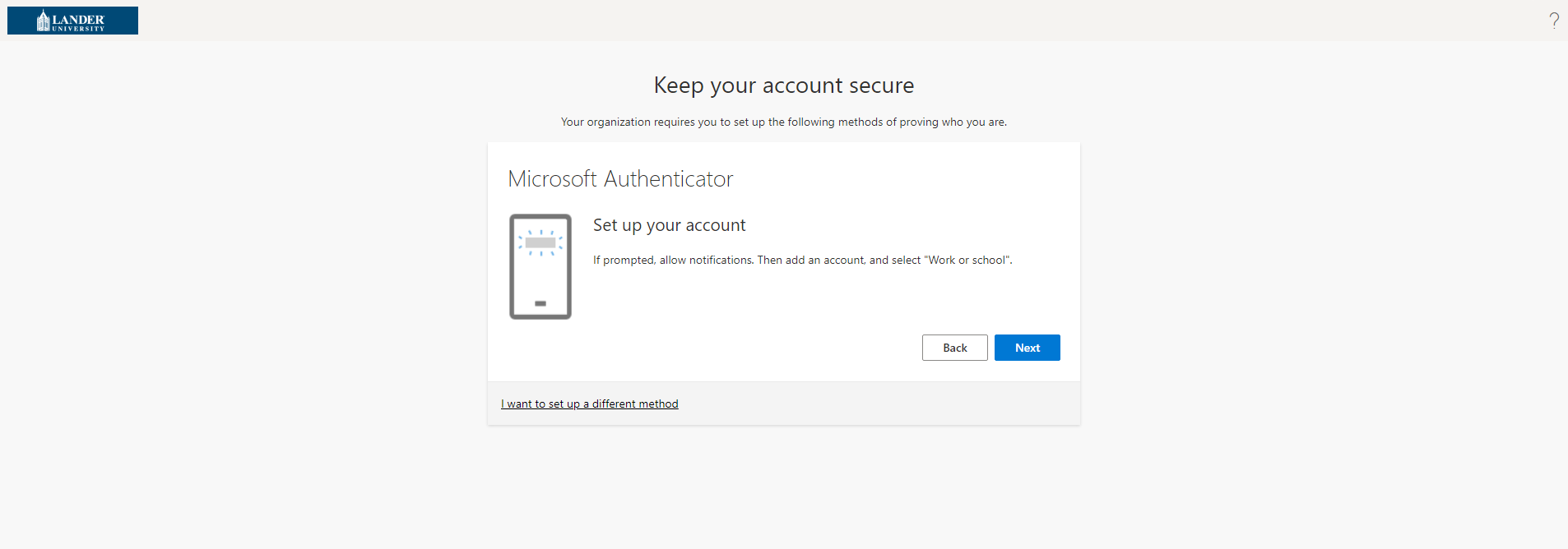 Multi-Factor Authentication(MFA) is an authentication method that will require you to provide two or more verification factors to log into your lander account. When you log in using MFA, you authenticate your identity by using a second factor, either a cell number, alternate authentication phone, or by using the Microsoft Authenticator App.