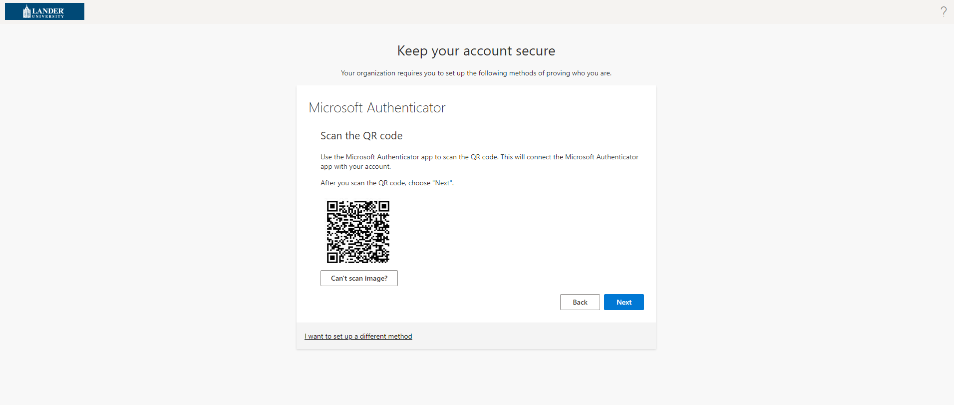On the Scan the QR code page, scan the displayed QR code with the authenticator app and then select Next. If you are unable to scan the QR code, select the Can’t scan image? option to get a code that you will be able to enter in the app.