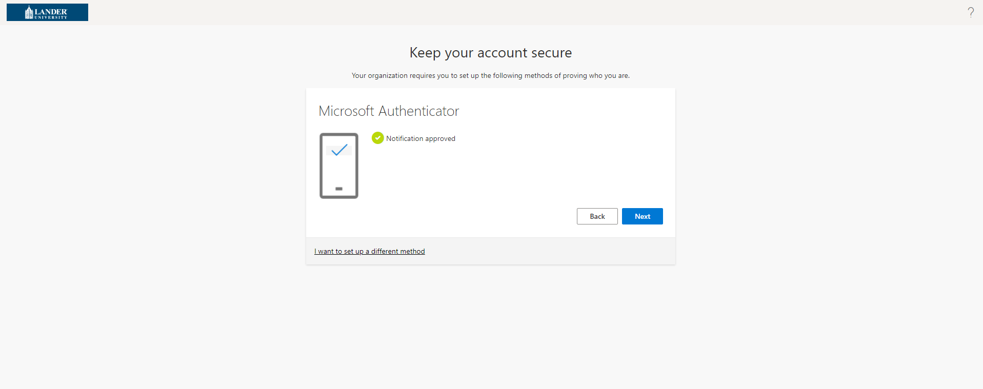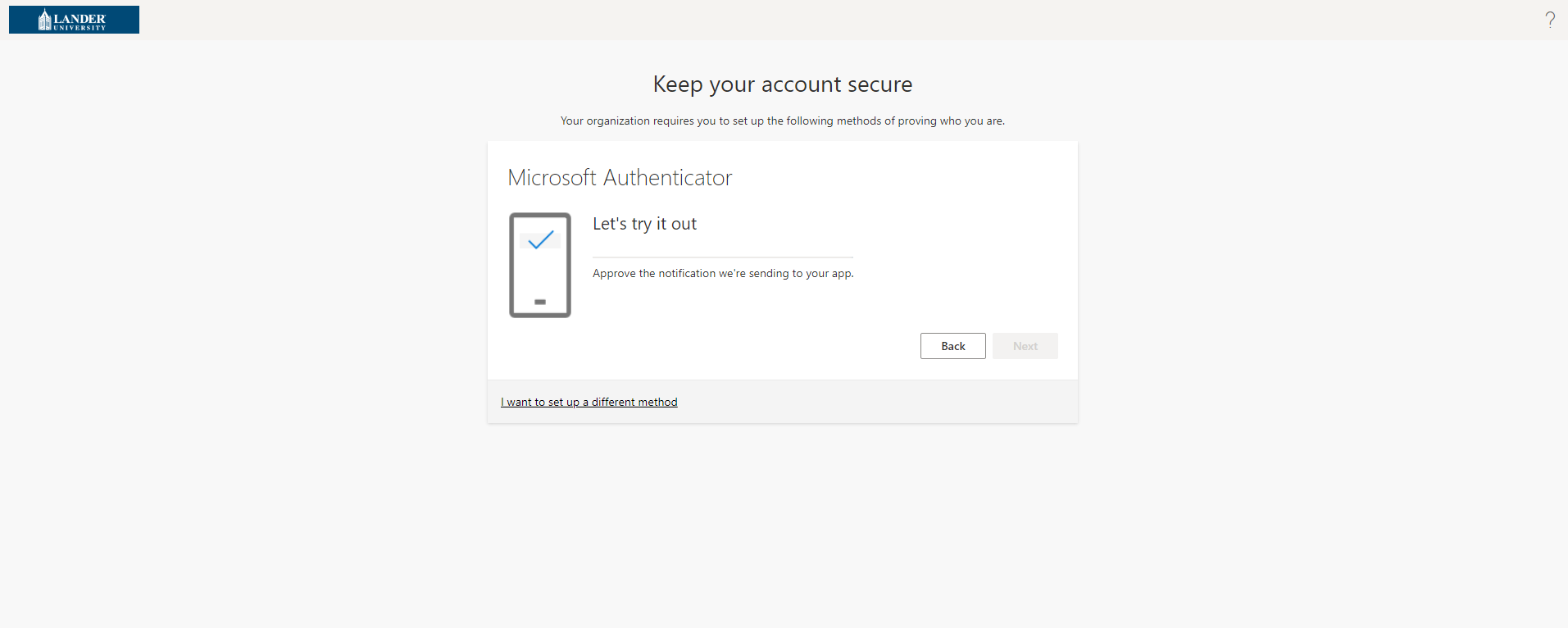 You will now be sent a notification on the app to approve. After approving the notification you have completed MFA setup. The next time you attempt to log into your Lander.edu account you will be prompted to use your second authentication method.
