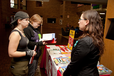 The week of Jan. 30 - Feb. 3 is Study Abroad Week at Lander University and throughout the week students will have opportunities to learn more about Lander's international programs and talk with others who have studied at foreign universities. Pictured, from left, Lander visual arts majors Kaitlyn Crawford, of Saluda and Jessica Brown, of Belton, speak with Mary Meadows, a program advisor with Academic Studies Abroad, an organization that works with universities to offer international programs and provide assistance for students studying abroad. Lander students have studied in ASA programs across Europe and in South America. Other events scheduled for the week include an informational session with Dr. Roger Richardson, with the University of Winchester; a study abroad forum hosted by Lander's student chapter of People to People; and a presentation by students and staff involved with Lander's Asia Initiative. For more information, visit www.lander.edu.