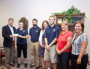 In the spring, Lander University's Physical Education and Exercise Studies (PEES) Club, hosted its first Bearcat Breakout 5K. The race is intended to be an annual event that promotes the health and fitness of the community by adopting an active lifestyle. The club also seeks to provide outreach within the area by donating all proceeds to a local organization or charity that embodies the spirit and promotes the strong values of the Greenwood community. This year, proceeds were presented to Connie Maxwell Children's Home. Pictured during the check presentation, from left, are: Eric Taylor, Connie Maxwell vice president for development; Julie Benefield, of Greenwood, PEES Club president; Dr. Leland Nielsen, Lander assistant professor of physical education and exercise studies; Dr. Jenny Lemoine, Lander assistant professor of physical education and exercise studies; Seth Whitehead, of Union, PEES Club; Dr. Kym Kirby, Lander associate professor of physical education and exercise studies; and Dr. Gina Barton, chair of Lander's Department of Physical Education and Exercise Studies.