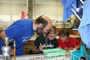 Lander University assistant professor of biology Kerry Hansknecht helps Stevie Manley, a home-schooled ninth-grader from Greenwood, and Matt Smith, a seventh-grader at Northside Middle School, identify the insect larvae they collected from a local stream. The students were participants in Hansknecht's Nature Study Day Camp, one of the Fuji Summer Science and Math Enrichment programs offered each summer at Lander.