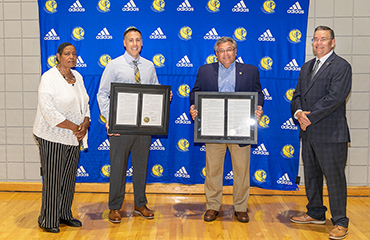 South Carolina Representatives John R. McCravy and J. Anne Parks, both of Greenwood, present Lander University Athletics with resolutions passed by the House of Representatives honoring the Lander men's and women's basketball teams for their respective Peach Belt Conference championship victories. While their seasons were abruptly ended in the wake of the COVID-19 pandemic, the women's victory secured a no. 1 seed in the NCAA tournament, while the men earned a no. 5 seed. Pictured, from left, are Rep. Parks, Women's Basketball Head Coach Kevin Pederson, Athletic Director Brian Reese, and Rep. McCravy.